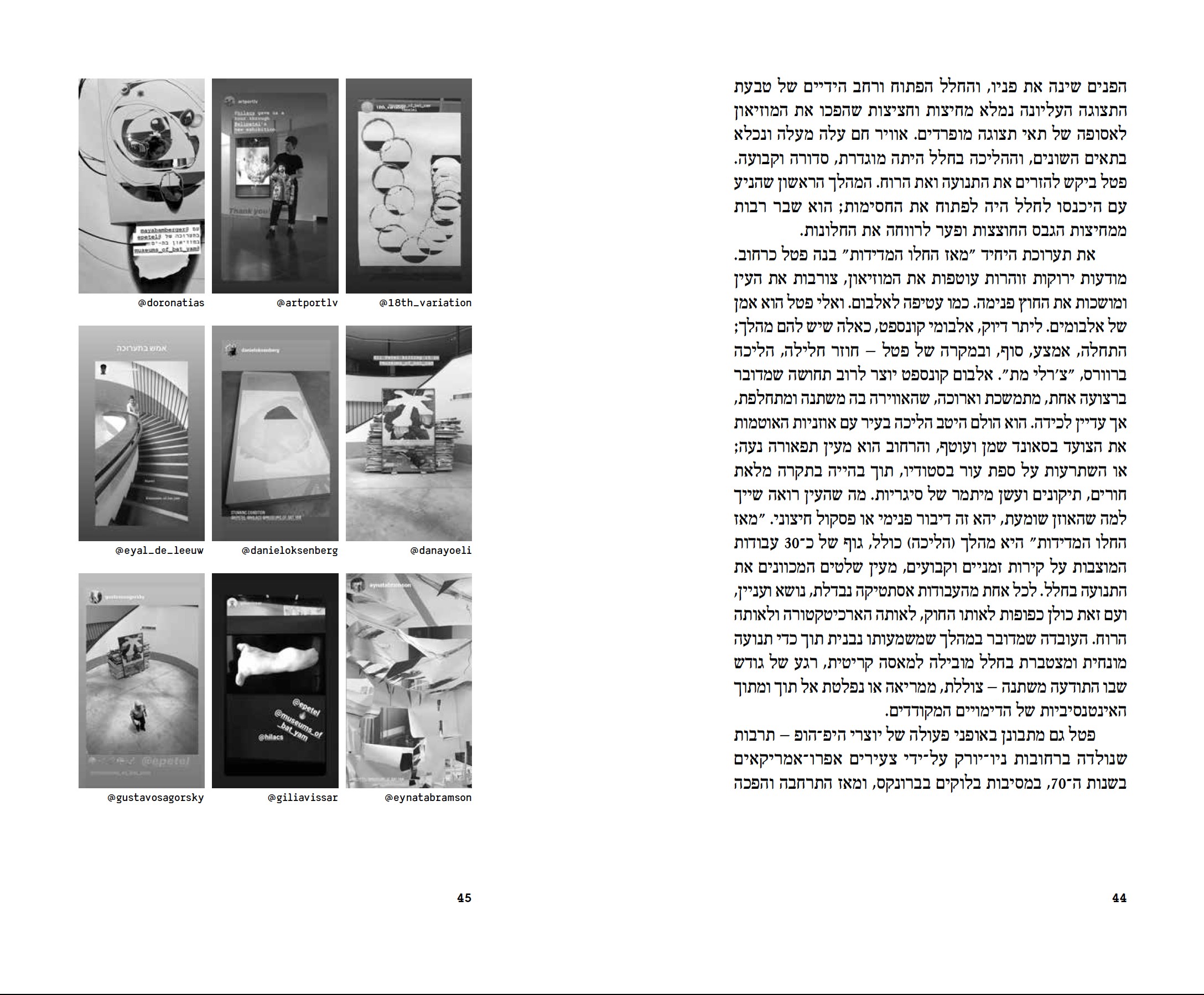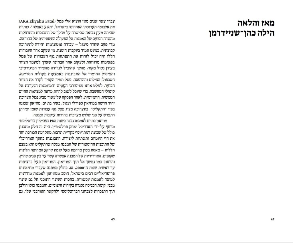 טקסטים מאת: הילה כהן־שניידרמן, אלי פטל, שאול סתר, ניקולה טרצי, רפרם חדד, תמר גטר, זהר אלמקייס, אבי סבח, יוני רז פורטוגלי, יותם דביר, משה דקל, ניר פפרברג ובועז לוין.